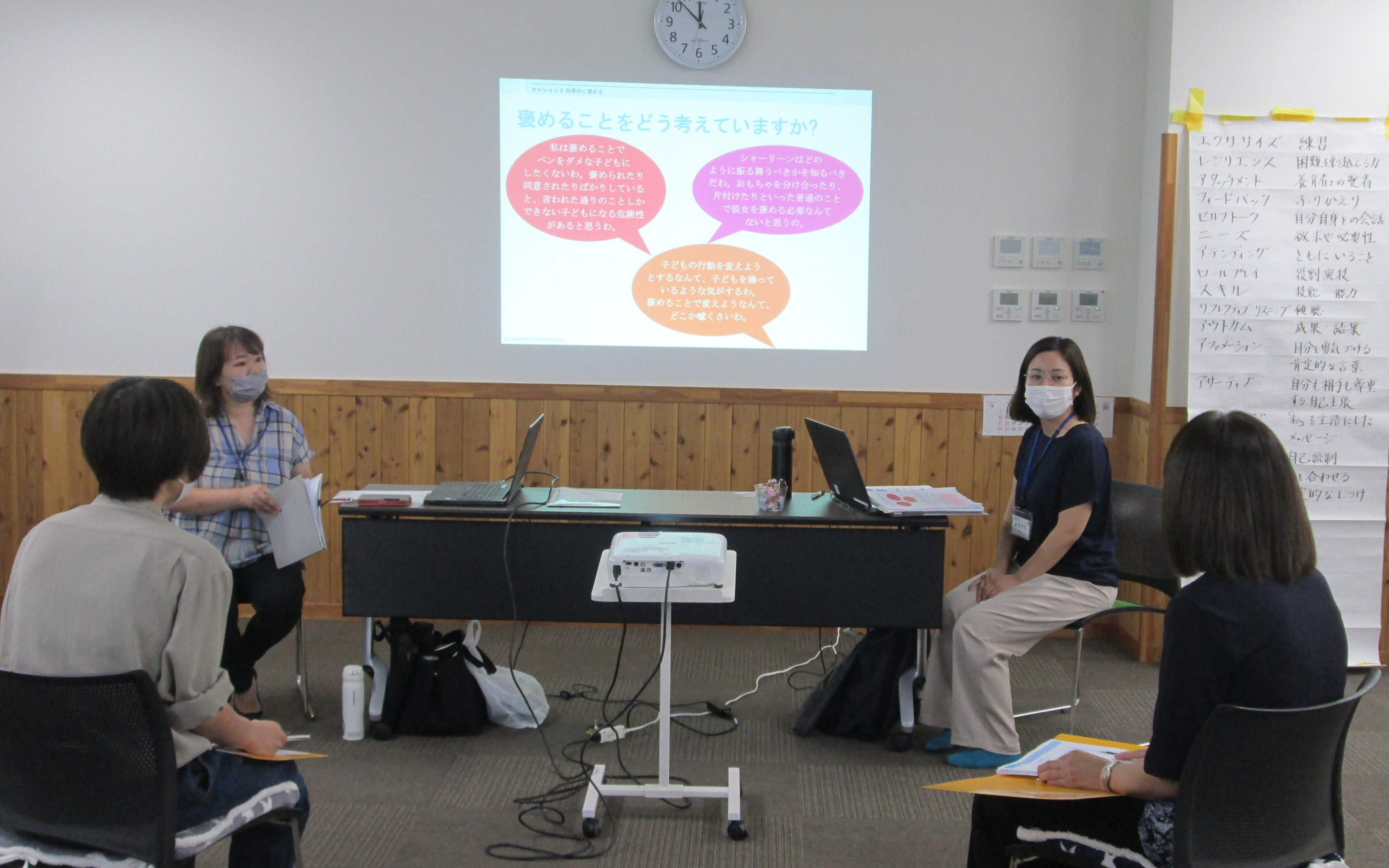 大川:私は乳児院の、増田さんは児童養護施設の職員でした。その経験から、こどもの愛着形成においては、特定の大人が毎日関わることの必要性を感じました。また、近所付き合いや、買い物、料理をするなど家庭での体験を通じて、こどもの五感が育ち、社会性も養われます。このような経験から、家庭養育の意義をお伝えしています。